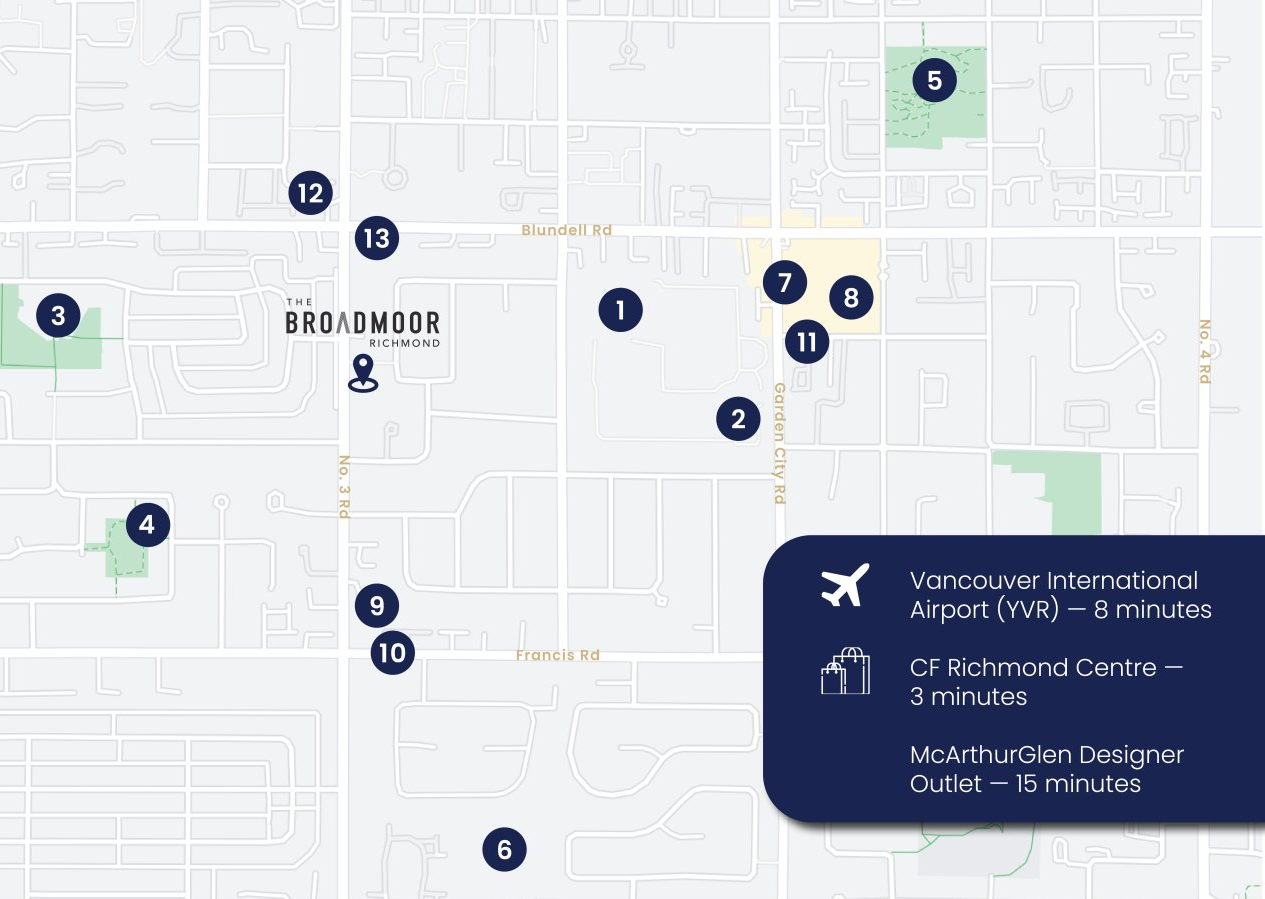 The Broadmoor is steps away from prime locations like Richmond Centre and is surrounded by a number of local parks and schools. Just a short drive away is the Garden City Shopping Centre, where you will find all of your daily needs as well as locally-owned restaurants and businesses. For any retail therapy you might find yourself needing, the renowned McArthurGlen Designer Outlet is only a 15 minute drive away.